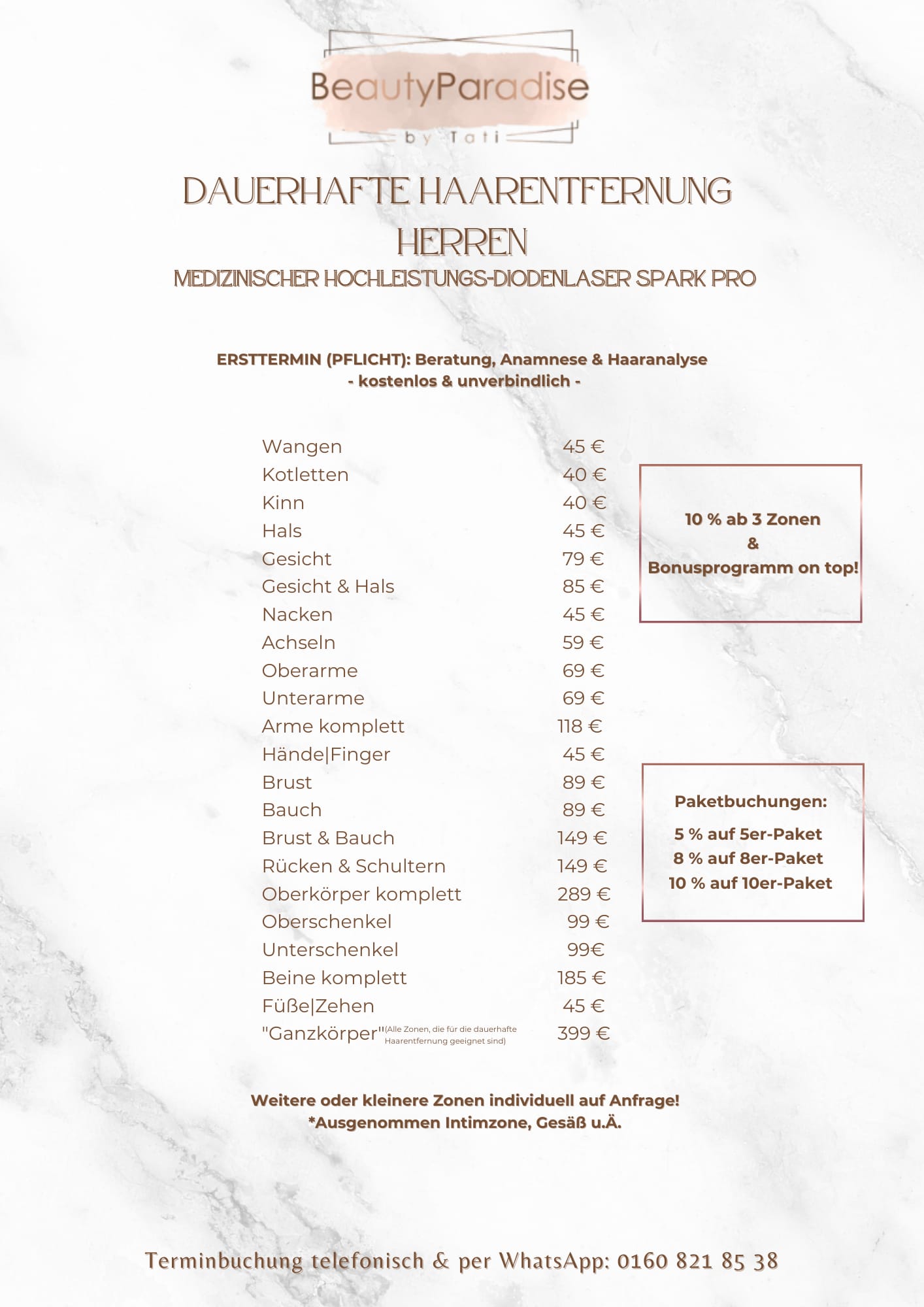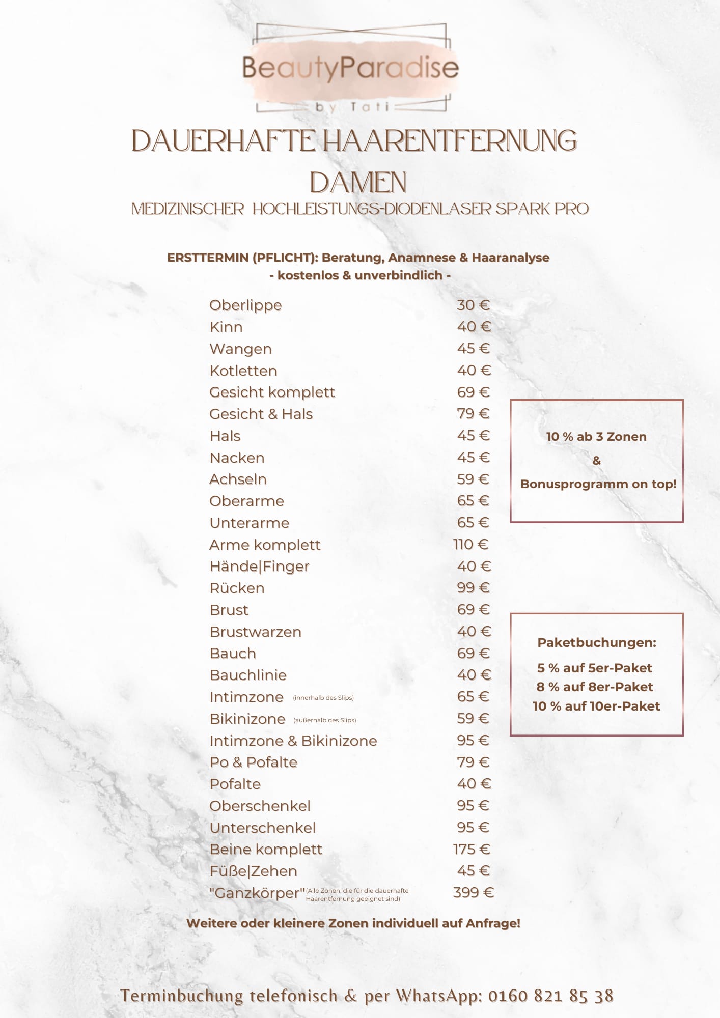 • Bereits 4 – 6 Wochen vor dem ersten Termin kein Waxing/Sugaring, Epilieren oder Zupfen mehr durchführen.